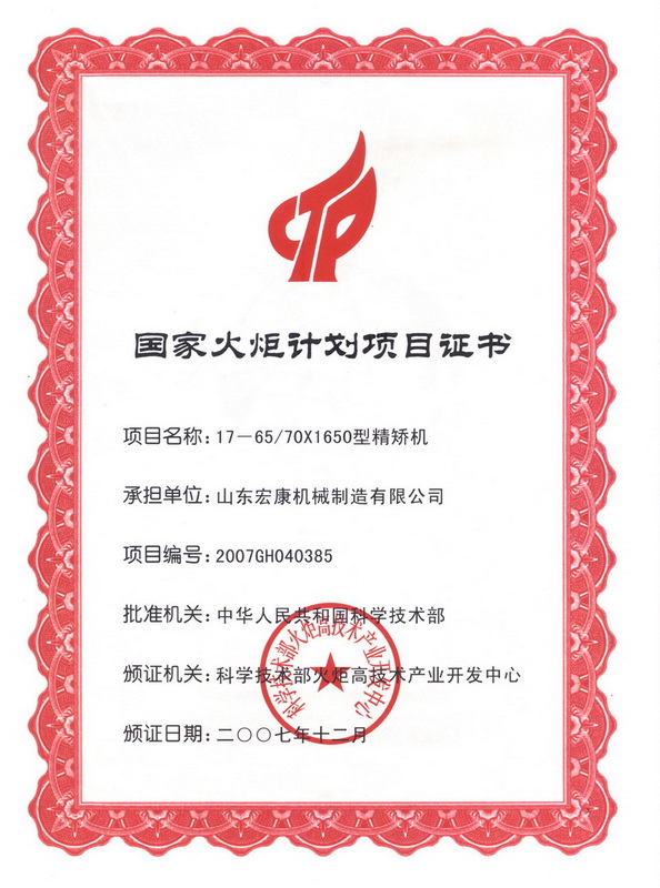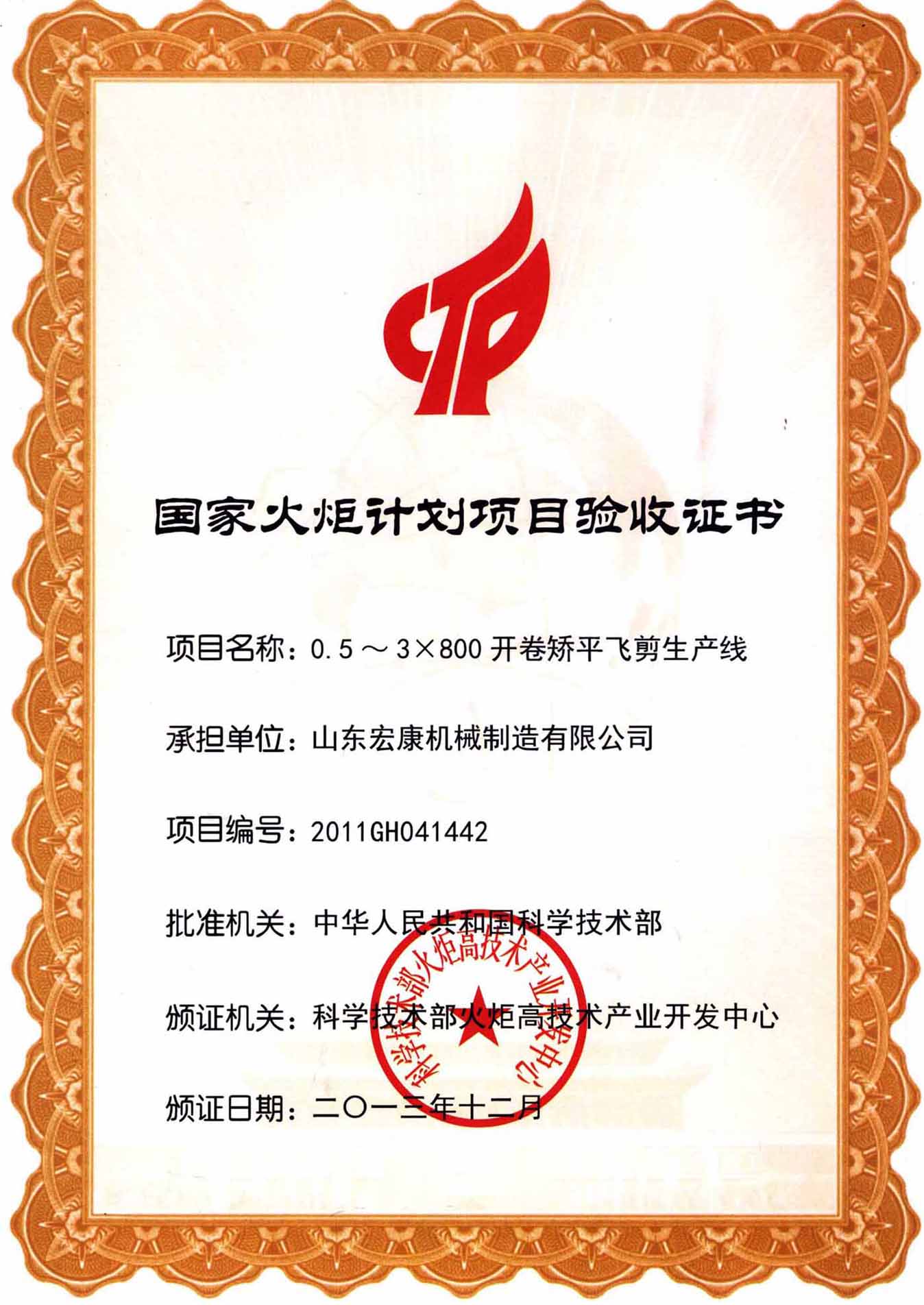 國(guó)家火炬計(jì)劃項(xiàng)目驗(yàn)收證書